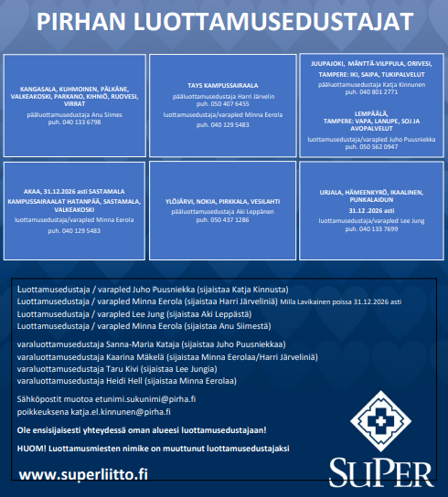 Pirkanmaan Hyvinvointialueen eli Pirhan SuPerilaisten luottamusedustajien yhteystiedot ja vastuualueet löydät alla olevasta kuvasta. Olethan ensisijaisesti yhteydessä oman alueesi luottamusedustajaan.